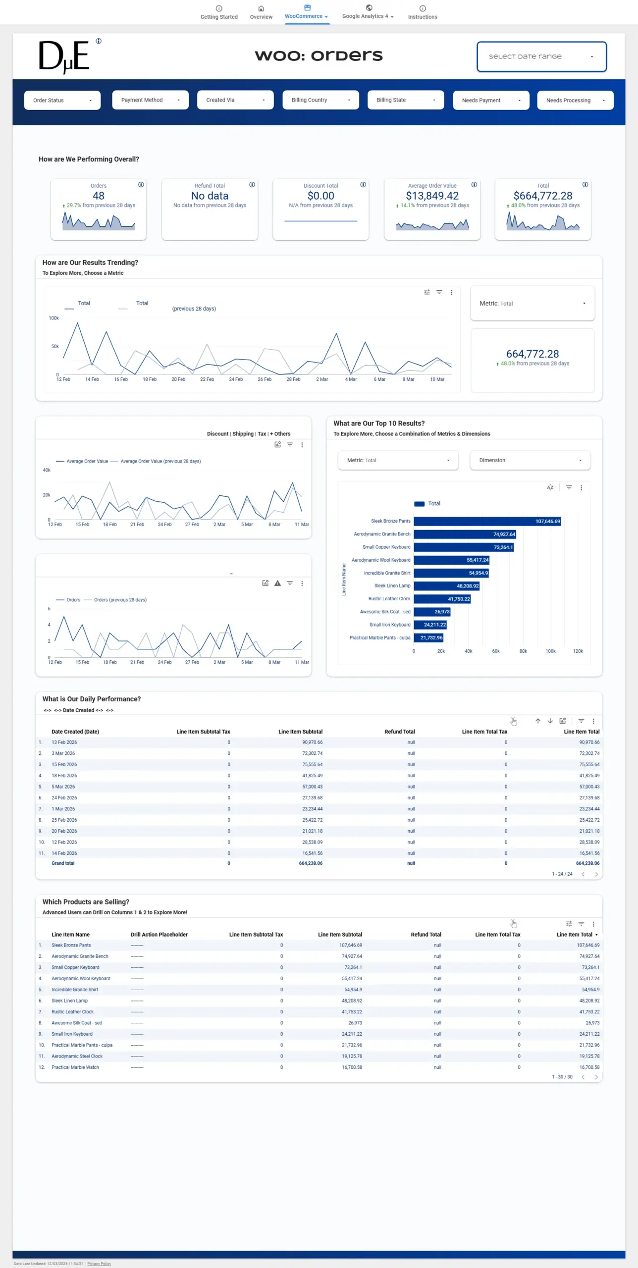 Use data from WooCommerce to create Actionable Dashboards in Looker Studio.